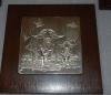 1979. Sterling silver wall sculpture, 7" x 7" mounted on 11 1/4" Philippine Mahogany base. Commissi...